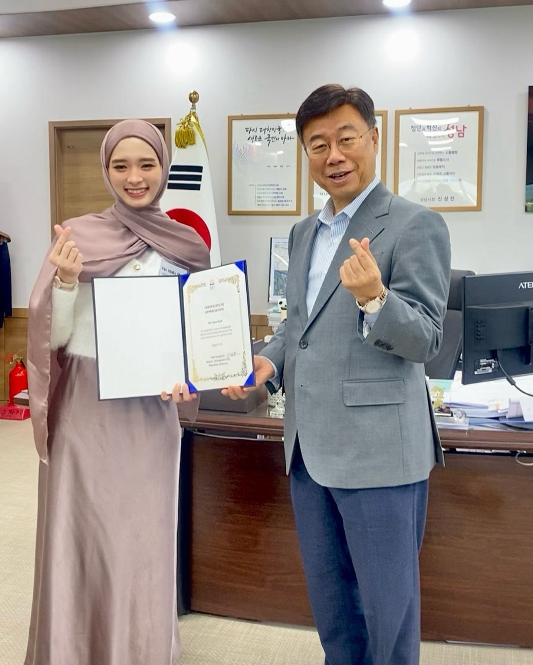 Inara dan pejabat tersebut sama-sama membuat gesture tangan "saranghae" atau "I love you" khas Korea, yang menunjukkan suasana akrab dan ramah dalam pertemuan ini. Di latar belakang, terlihat beberapa dokumen dan penghargaan yang dipajang, mengindikasikan lingkungan yang formal dan profesional.