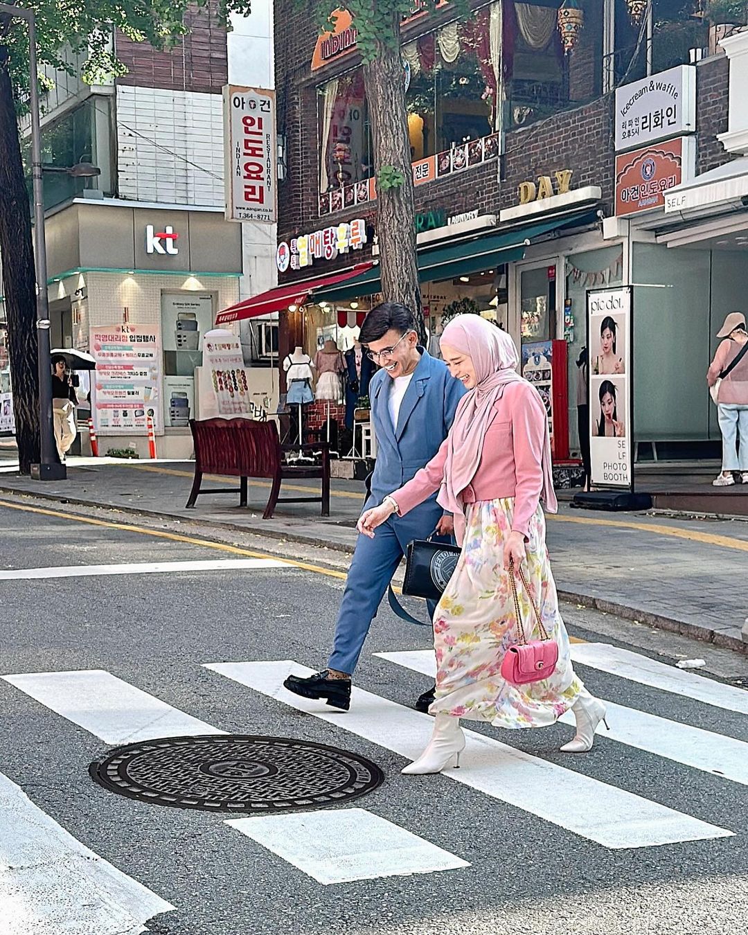 Melihat dari foto tambahan ini, Inara Rusli tampak sedang menikmati momen bersama seseorang, mungkin rekannya, saat berjalan-jalan di sebuah kawasan kota di Korea Selatan. Mereka terlihat menyusuri zebra cross dengan penuh kebahagiaan, memperlihatkan senyuman yang lebar dan penuh keceriaan.