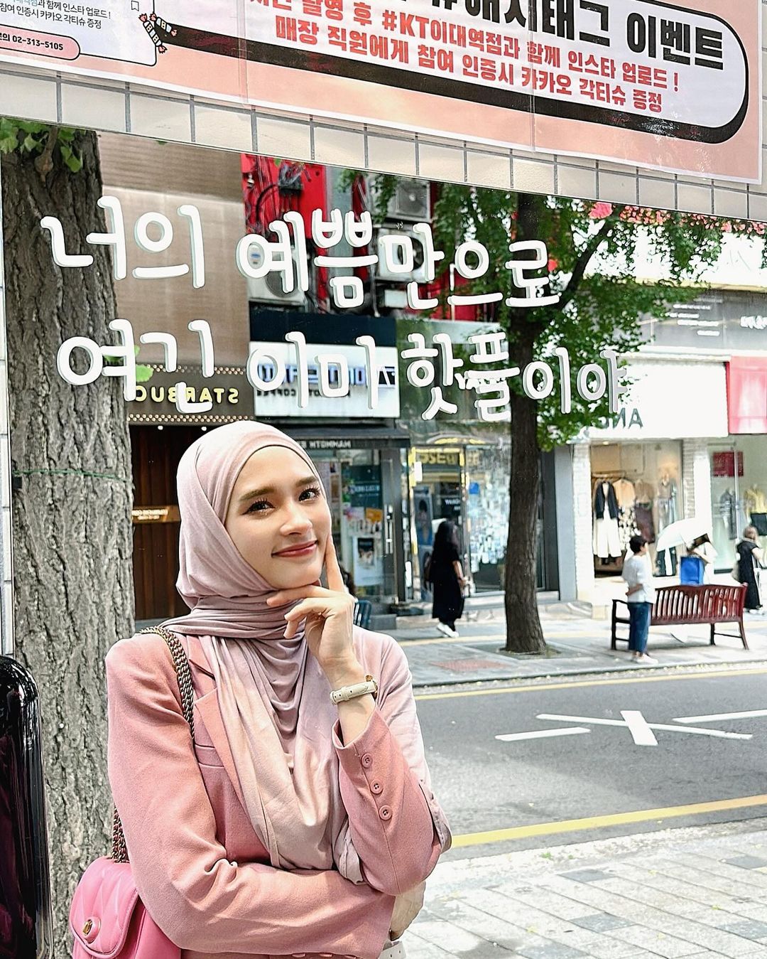 Kios-kios dan toko-toko di latar belakang menunjukkan bahwa ini adalah tempat yang populer untuk dikunjungi oleh wisatawan dan penduduk lokal. Kemungkinan, Inara sedang berada di salah satu kawasan terkenal di Korea Selatan seperti Myeongdong atau Gangnam, yang dikenal dengan toko-toko fashion dan kafe-kafe trendi.