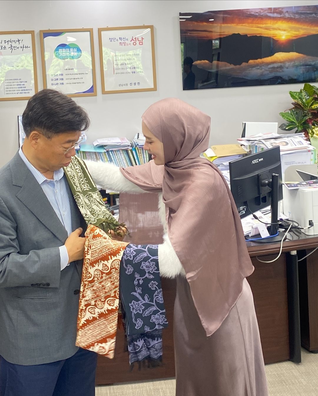 Dalam foto kedua, Inara Rusli tampak memberikan hadiah berupa kain tradisional Indonesia kepada pejabat Korea Selatan. Ini menunjukkan adanya pertukaran budaya yang hangat antara Indonesia dan Korea Selatan. Inara terlihat penuh senyum saat menyampirkan kain batik di pundak pejabat tersebut, yang tampak menerima dengan senang hati.