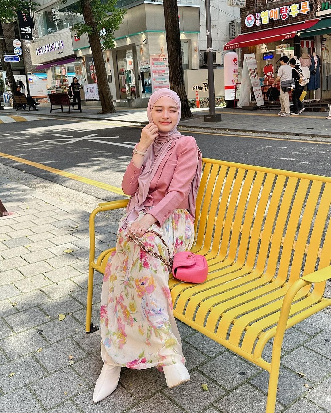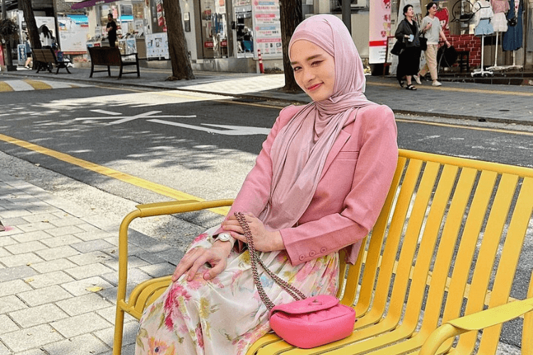 Inara Rusli sedang menikmati suasana kota di Korea Selatan. Di foto ini, dia tampak duduk dengan santai di sebuah bangku kuning yang berada di tepi jalan. Di latar belakang, terlihat beberapa toko dan restoran yang menambah nuansa urban khas Korea.